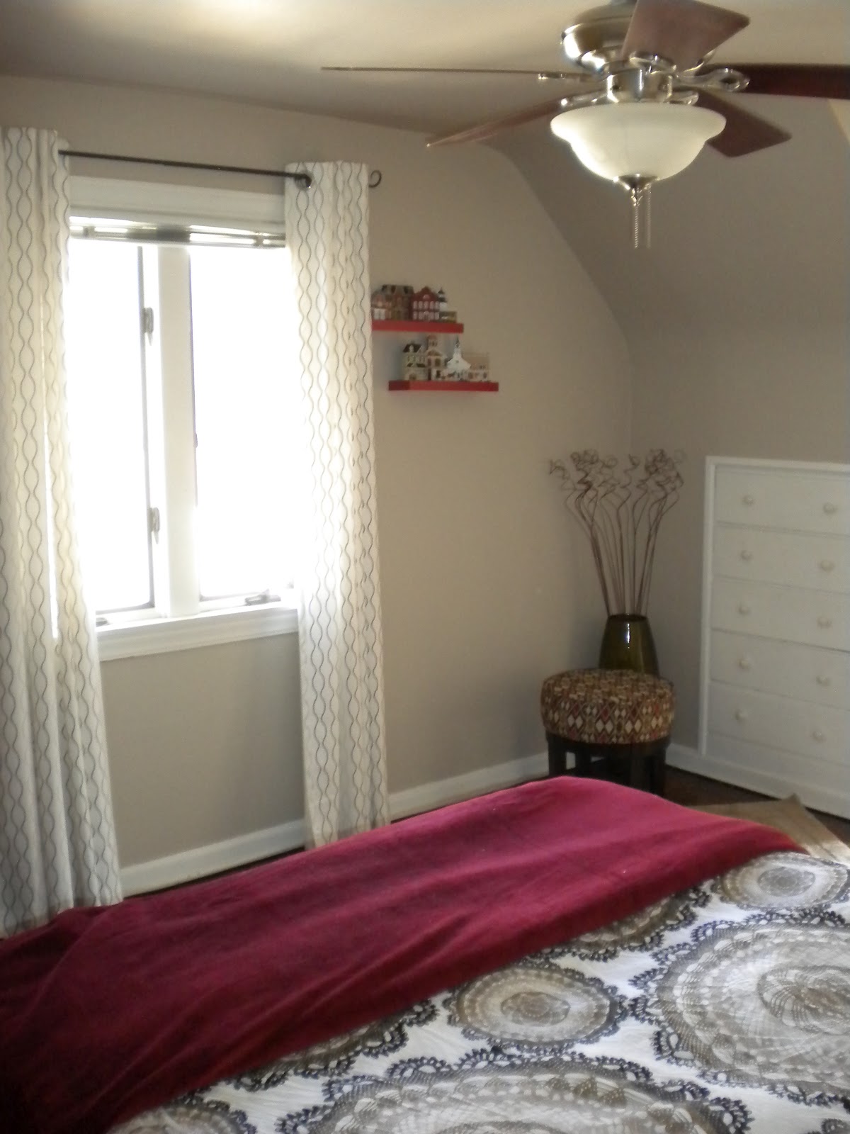 | Today, walls painted, mirror up, new(ish) bedding, cat. |
